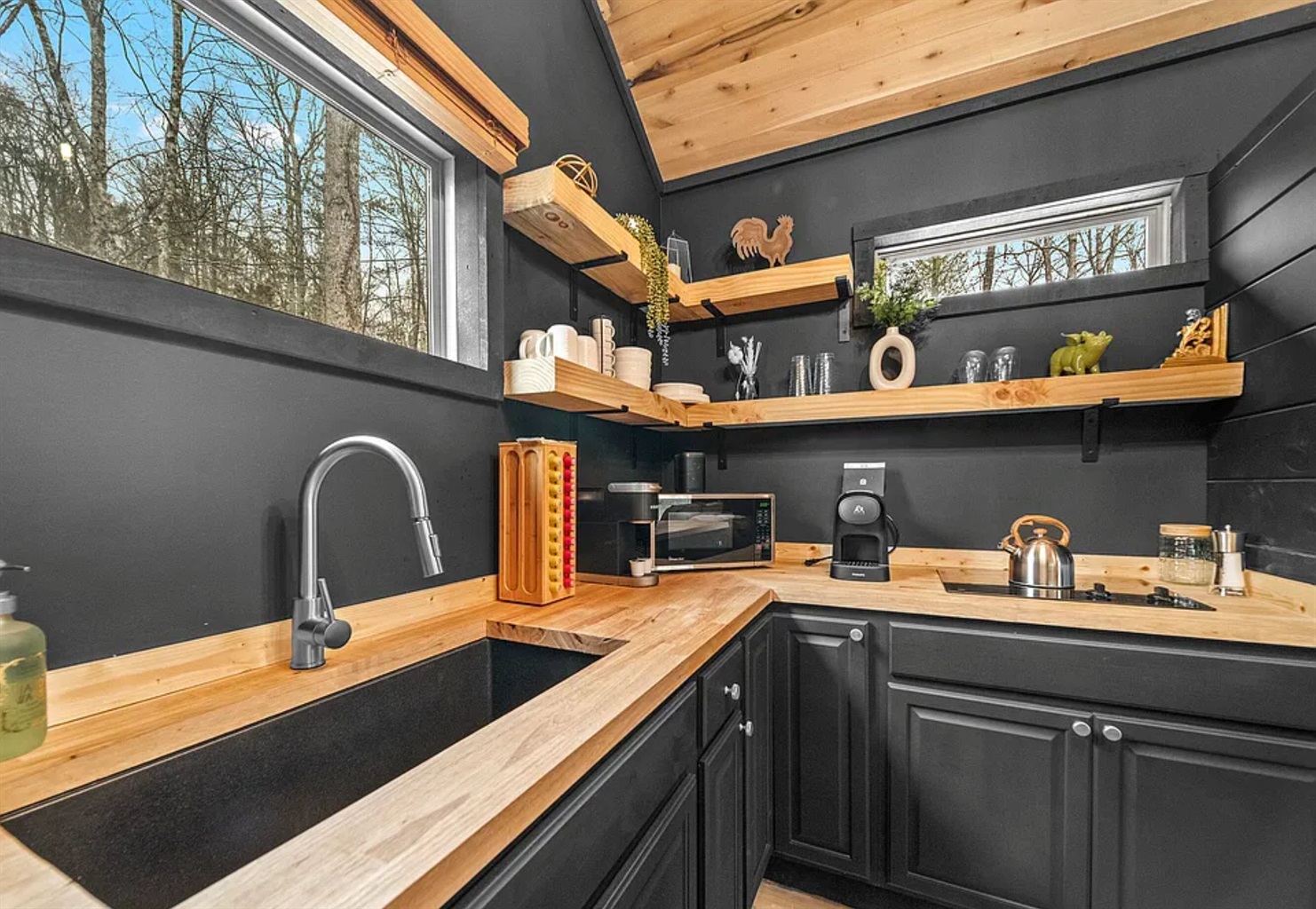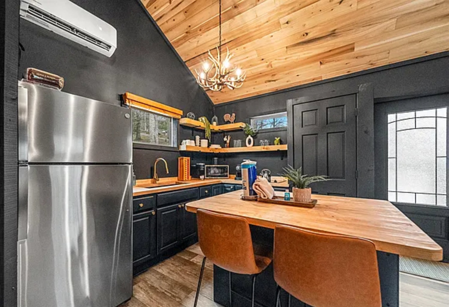 • Tall ceilings + cozy cabin style
