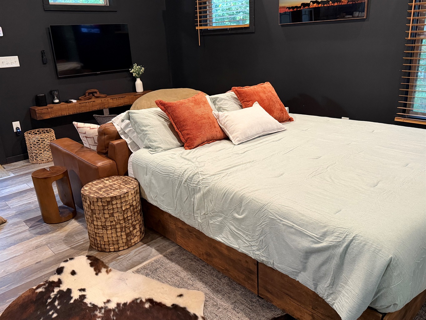 • Comfy leather couch + cowhide rug